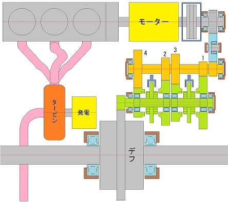 内燃エンジンへターボ加給するとコストが急上昇してしまいますので、排気にはタービンと発電機のみで済ませます。