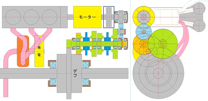 次の図では、ミッションのインプットシャフトとアウトプットシャフトを上下に重ねて、コンパクト化しました。